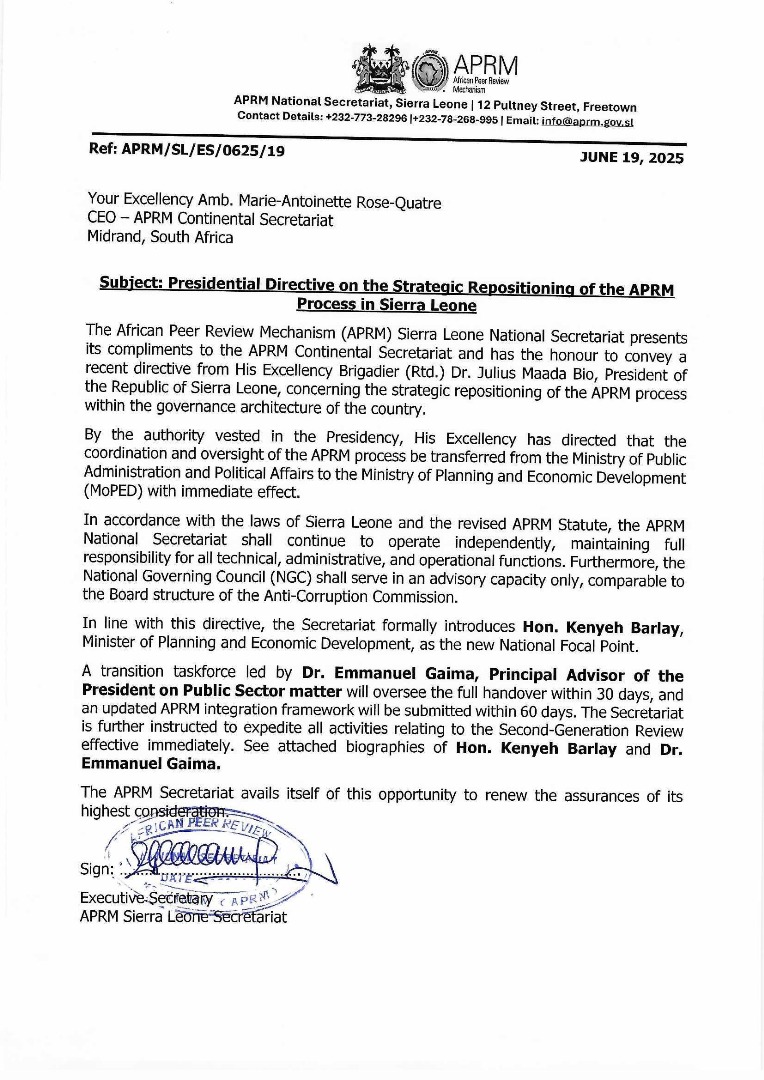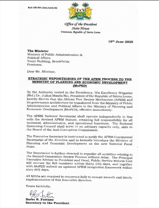 In a landmark move reaffirming Sierra Leone’s commitment to institutional reform and governance excellence, His Excellency Brigadier (Retired) Dr. Julius Maada Bio, President of the Republic of Sierra Leone, has issued an Executive Directive transferring the African Peer Review Mechanism (APRM) process from the Ministry of Public Administration and Political Affairs (MPAPA) to the Ministry of Planning and Economic Development (MoPED). The directive takes immediate effect and is seen as a strategic repositioning of APRM within the government’s development and accountability architecture